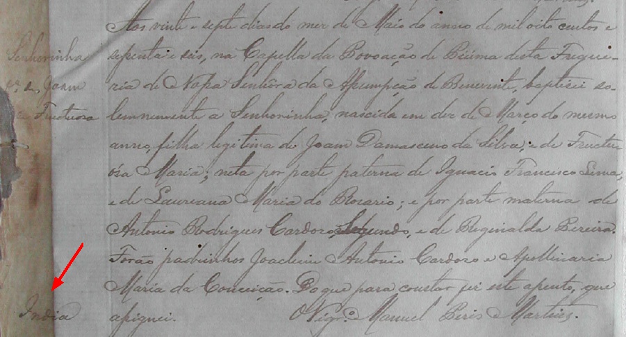 - Senhorinha (India ), nascida no dia 10/03/1866, batizada no di 27/05/1866, na Capela da Povoação de Piuma-ES