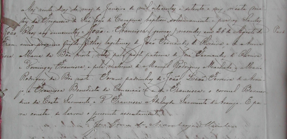 - João e Francisca (gêmeos), nascidos no dia 26/08/1875, batizados no dia 20/01/1876, na Matriz da Freguesia de São João de Carapina-ES