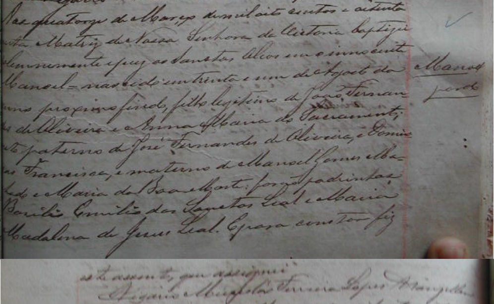 - Manoel, nascido no dia 31/08/1879, batizado no dia 14/03/1880, na Matriz de Vitoria-ES