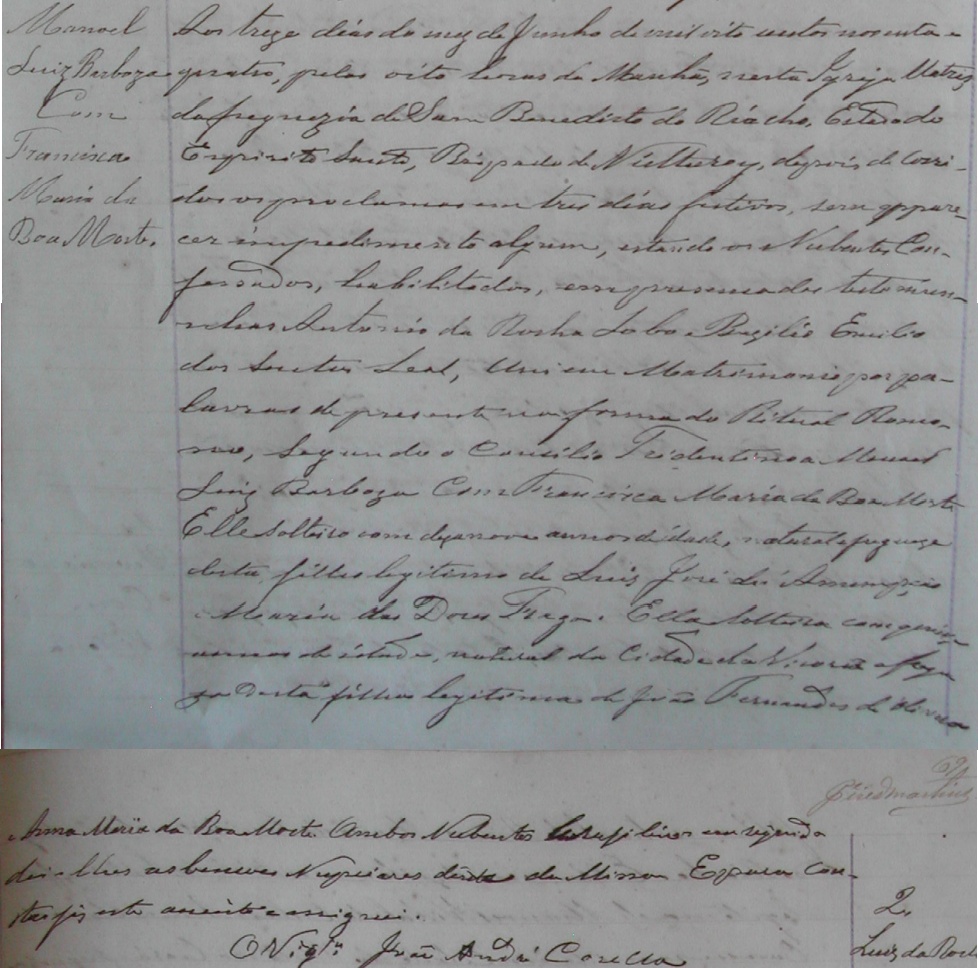 Casaram-se no dia 13/06/1894, pelas 8 horas da manhã, na Igreja Matriz da Freguezia de São Benedito de Riacho-ES