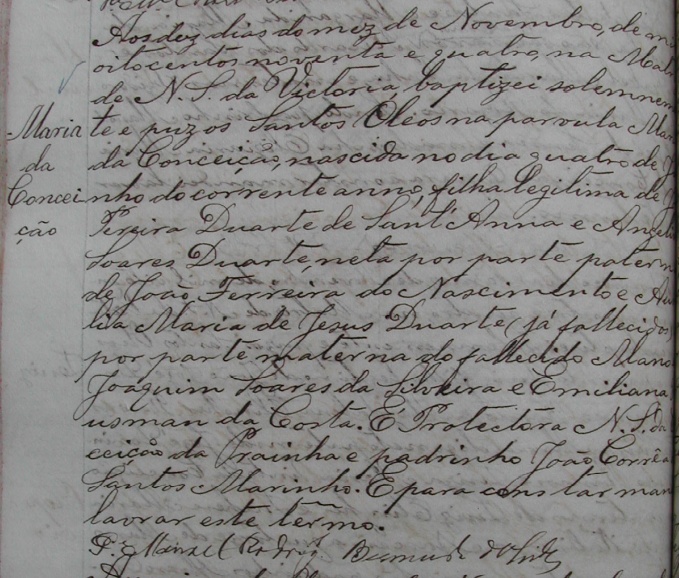 - Maria da Conceição, nascida no dia 04/06/1894, batizada no dia 10/11/1894, na Matriz de Vitoria-ES