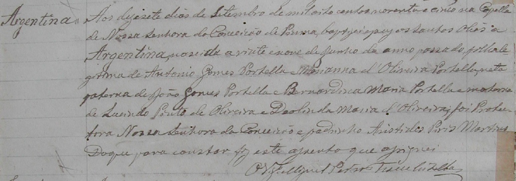 - Argentina, nascida no dia 29/06/q894, batizada no dia 17/09/1895, na Capela de Nossa Senhora da Conceição de Piuma-ES