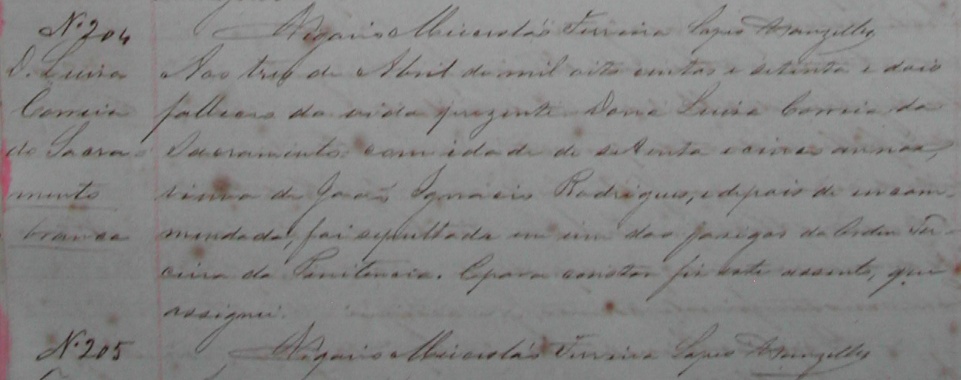 Luiza Correia do Sacramento, faleceu no dia 03/04/1872, com 75 anos de idade