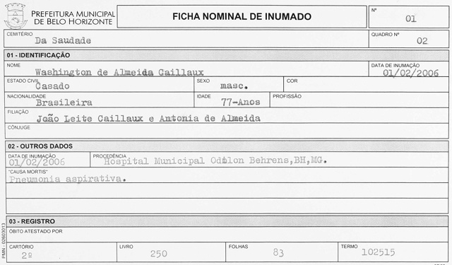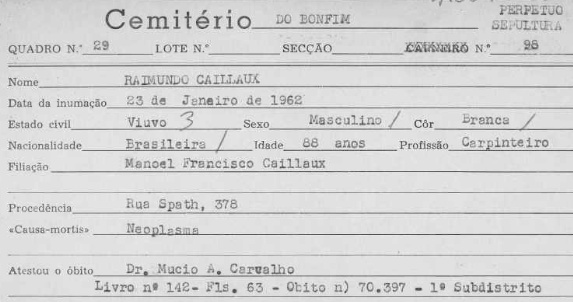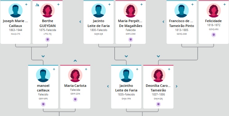 https://www.familysearch.org/pt/tree/pedigree/portrait/PM6N-Z5P Pais: Raymundo Nonato Caillaux e Theodora Leite de Faria (1874 - 23/01/1962-MG) (1874 - 09/02/1954) Falecimento de Raymundo Nonato Caillaux https://www.familysearch.org/ark:/61903/1:1:7BJW-Y9MM?lang=pt (Árvore FamilySearch: https://www.familysearch.org/pt/tree/pedigree/portrait/GZVQ-F9J)