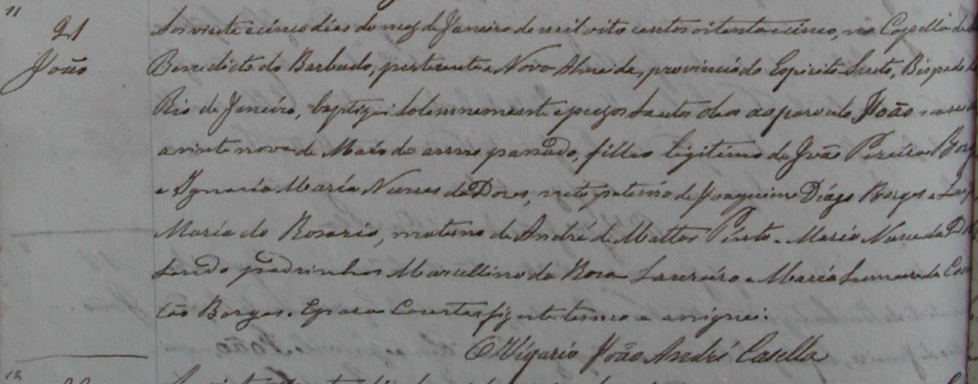 - João, nascido no dia 29/05/1884, batizado no dia 25/01/1885, na Capella de São Benedito do Barbado, pertencente a Nova Almeida-ES