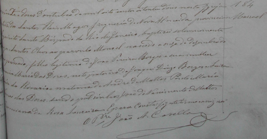 - Manoel, nascido no dia 11/12/1881, batizado no dia 22/10/1882, na Matriz dos Santis reis Magos, Freguesia de Nova Almeida-ES