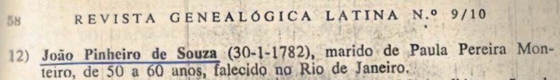1 - Manoel Pinheiro de Souza nasceu aos 24 de dezembro e foi batizado na Sé do Rio de Janeiro em 06-01-1749. Casou com Teresa Maria de Jesus, natural da freguesia de N. Sra do Pilar do Iguaçu, filha de Antonio da Rocha Solha, natural de Santo Ildefonso extramuros de Lisboa e de Teresa de Jesus, natural de Pilar do Iguaçu e casados na cidade do Rio de Janeiro em 27-11-1741, neta paterna de Ilario da Rocha e de Luiza Soares, neta materna de Antonio João e Maria do Pilar.