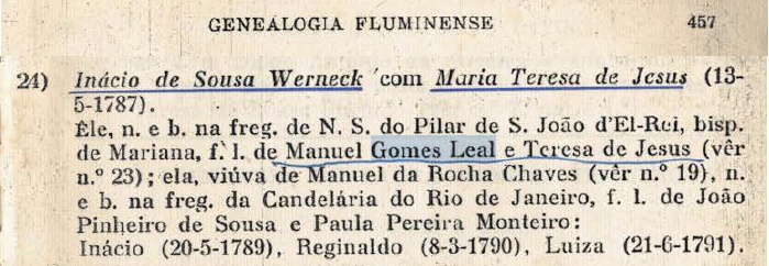 8 - Maria Tereza de Jesus (Viuva de Manoel da Rocha Tavares) c.c. Ignacio de Sousa Weneck, filho de Manoel Gomes Leal e Tereza de Jesus