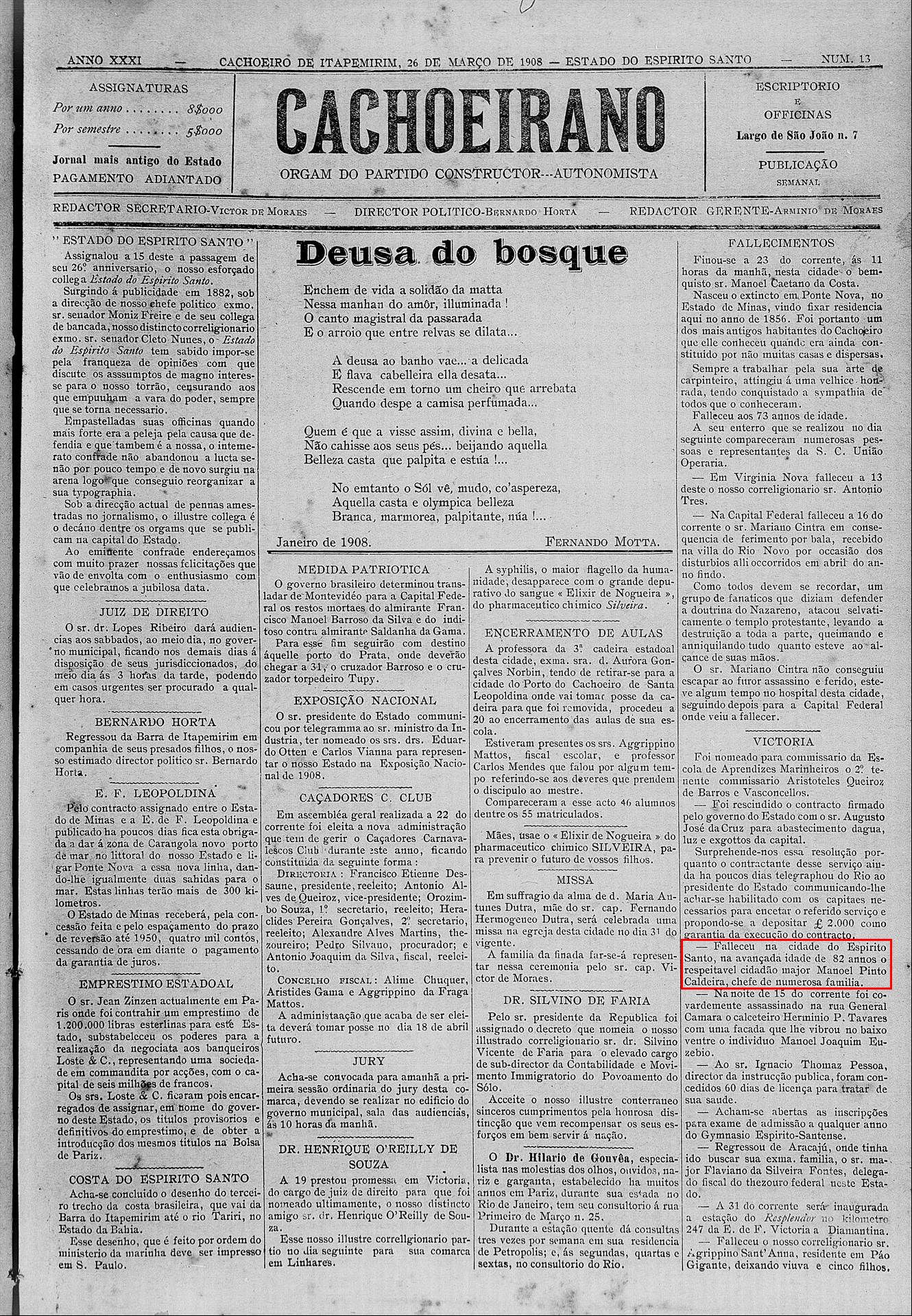 - (Hipótese) Major Manoel Pinto Caldeira, (*1826 - 1908) falecido com 82 anos de idade, em 1908, residente em Vila Velha-ES, chefe de numerosa familia, conforme jornal abaixo