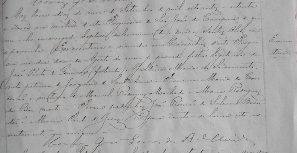 - Emerentina, nascida em Carapebuz-ES, no dia 12/08/1884, batizada no dia 13/09/1885, na Freguesia de São João de Carapina-ES