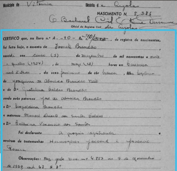 Ivonete, nascida no dia 05/12/1924, às 12 horas, em Cariacica-ES