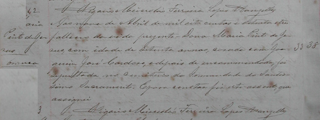 Maria Pinto de Jesus faleceu no dia 09/04/1873, com 70 anos de idade, casada com Joaquim Jose Cardoso