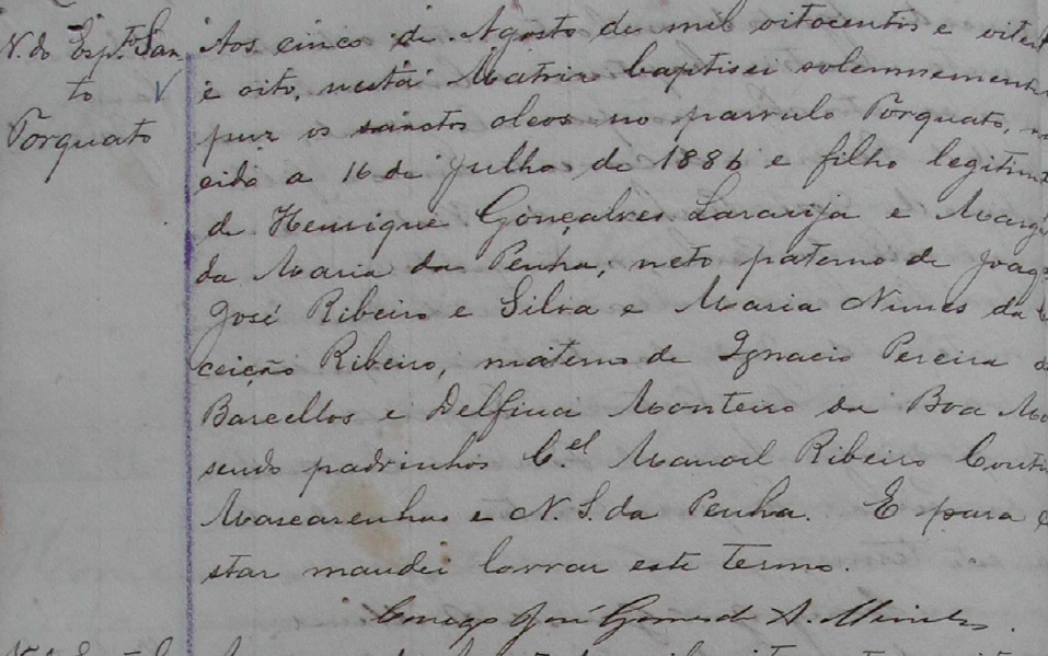 - Torquato, nascido no dia 16/07/1886, batizado no dia 05/08/1888, na Matriz de Vitoria-ES