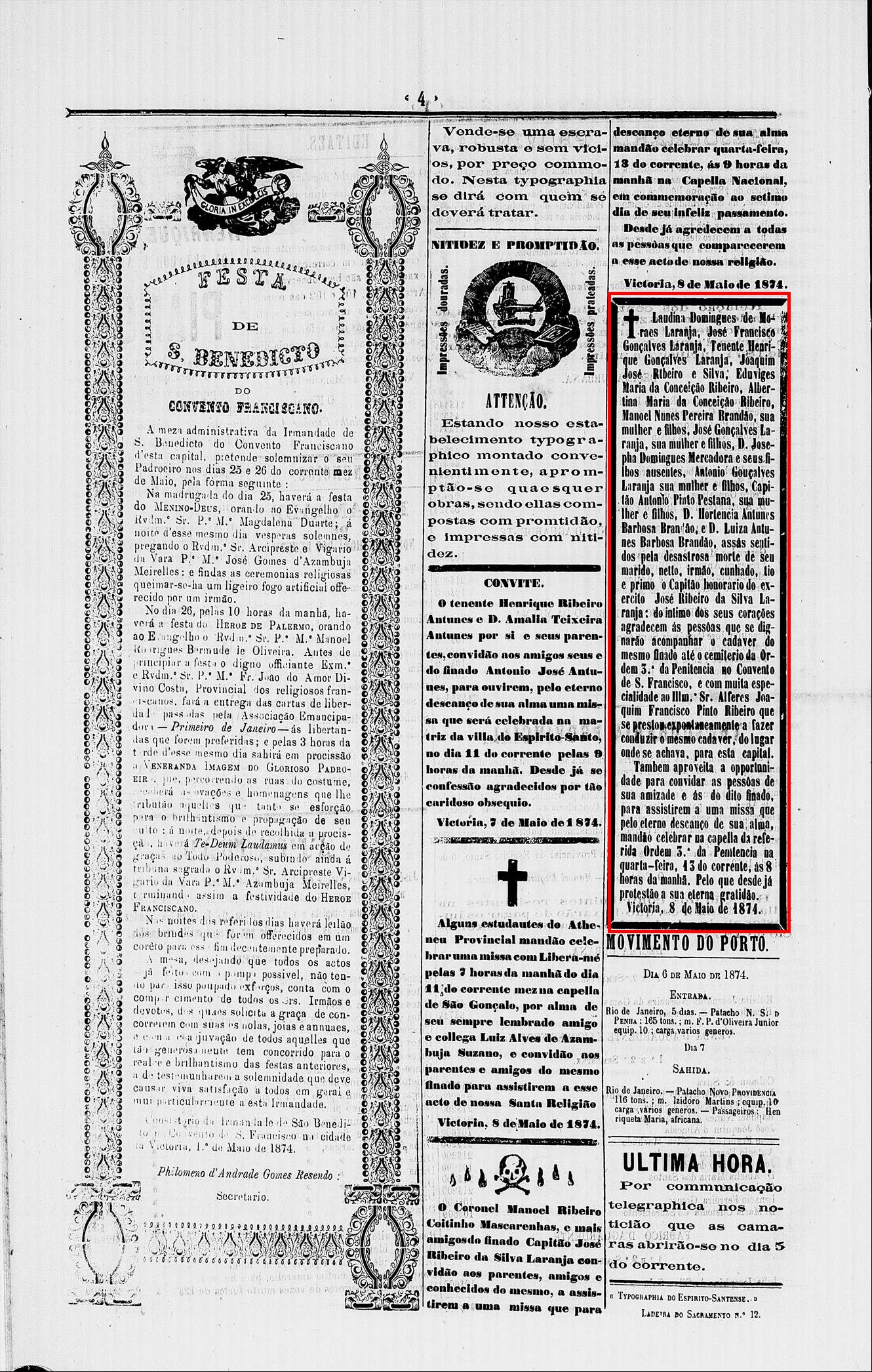 1873 foi anunciado aniversário do seu passamento, no Jornal Espirito Santense - Ano 1873\Edição 00168 (1)- Página 4