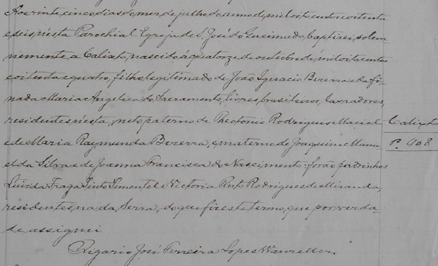 Calixto Bezerra, nascido no dia 14/10/1884, batizado no dia 25/07/1886, na Parochial Igreja de São Jose do Queimado-ES