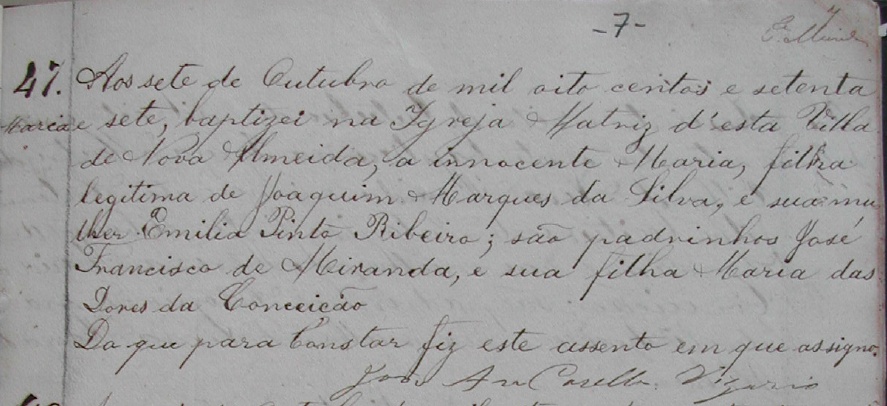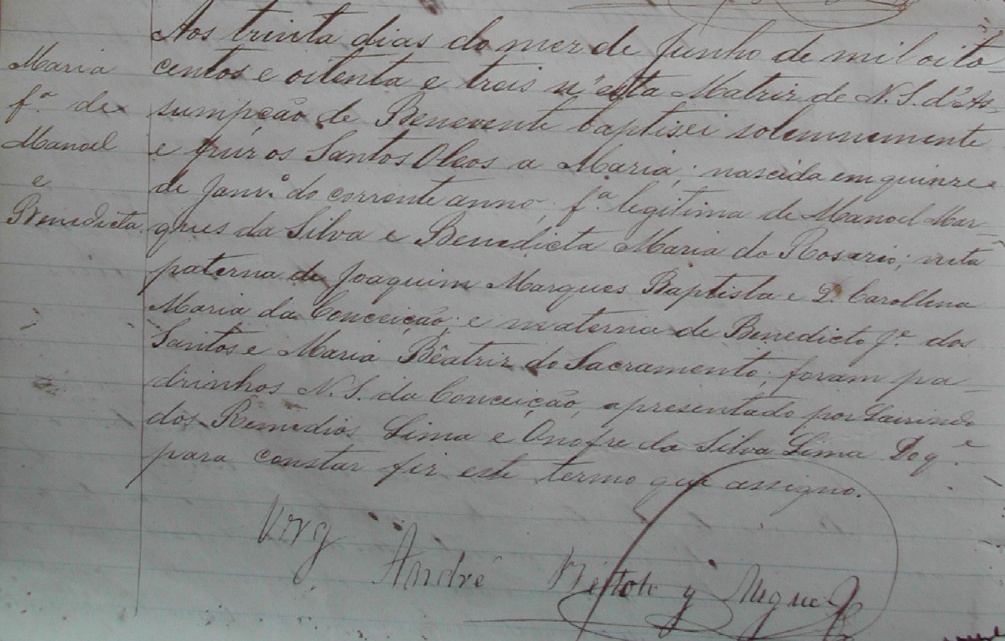 - Maria, batizada no dia 07/10/1877, na igreja Matriz da Vila de Nova Almeida-ES