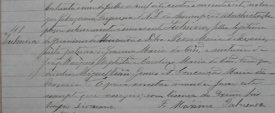 Padrinhos: Jose Francisco de Miranda e sua filha Maria das Dores da Conceição