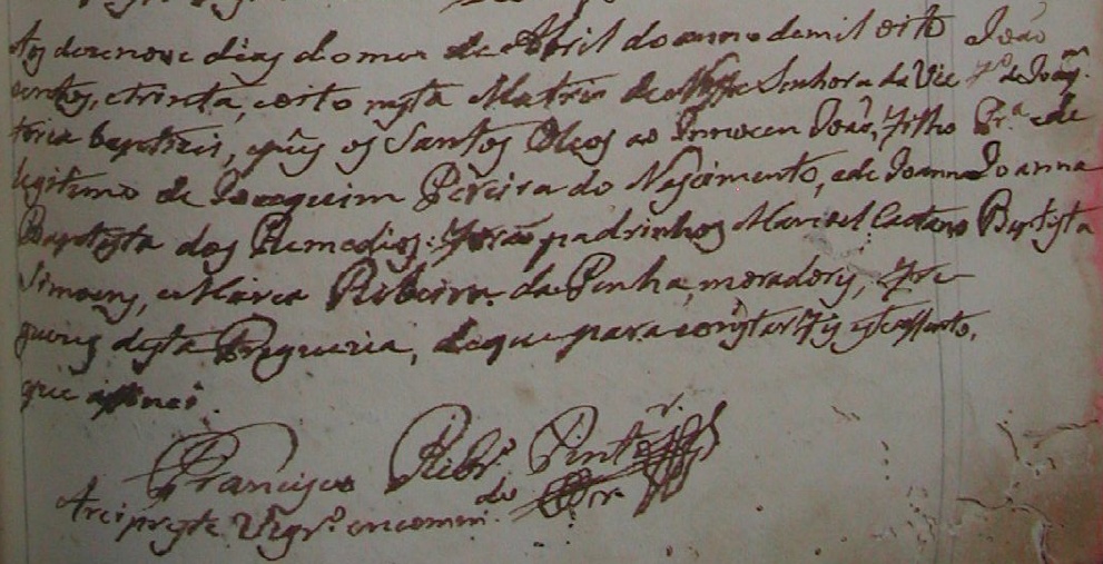 João, batizado no dia 19/04/1838, na Matriz de Nossa Senhora da Vitoria-ES