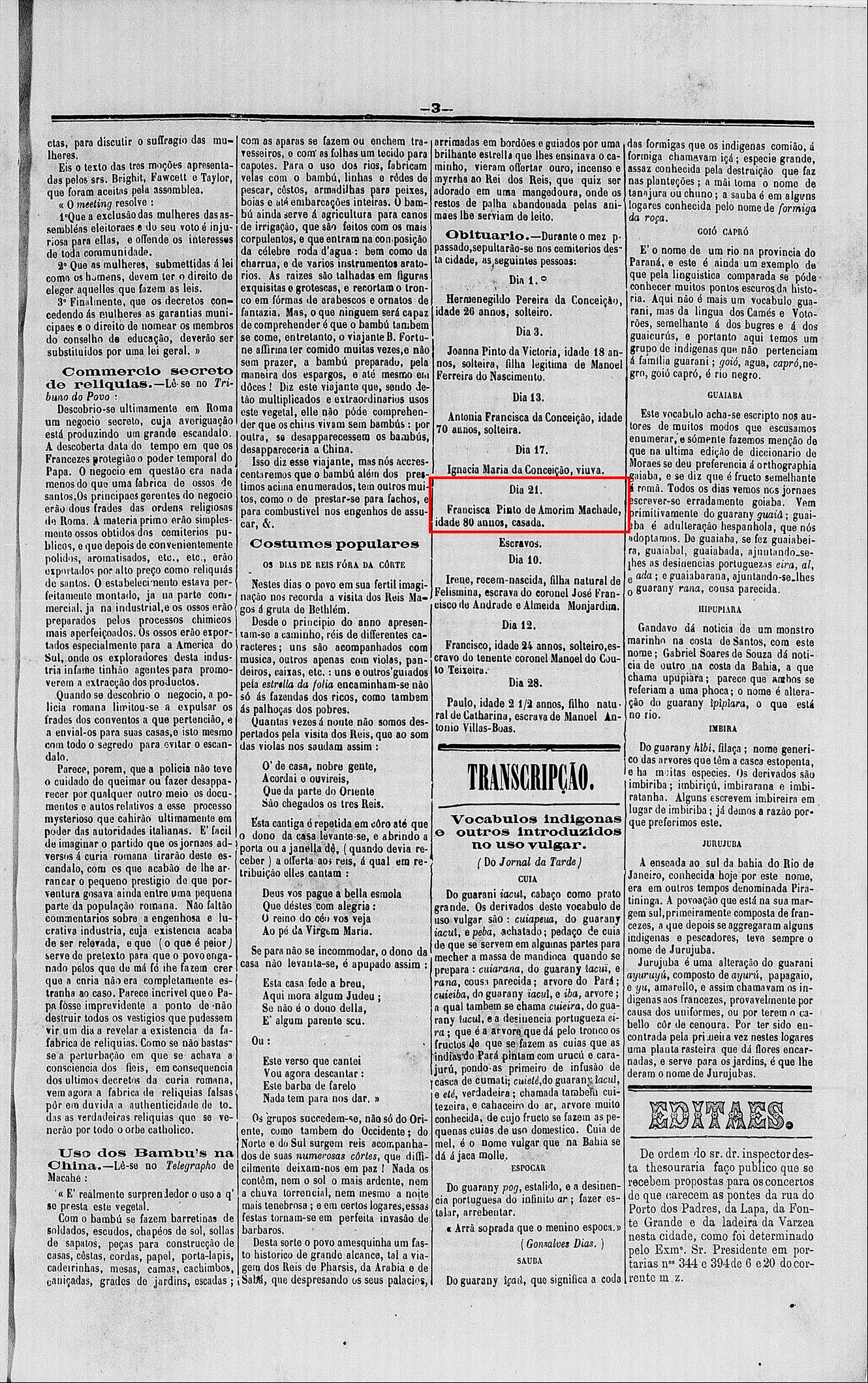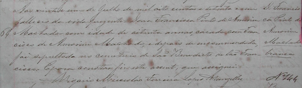 - (Hipótese) Francisca Pinto de Amorim Machado falecida no dia 21/07/1871, com 80 anos de idade
