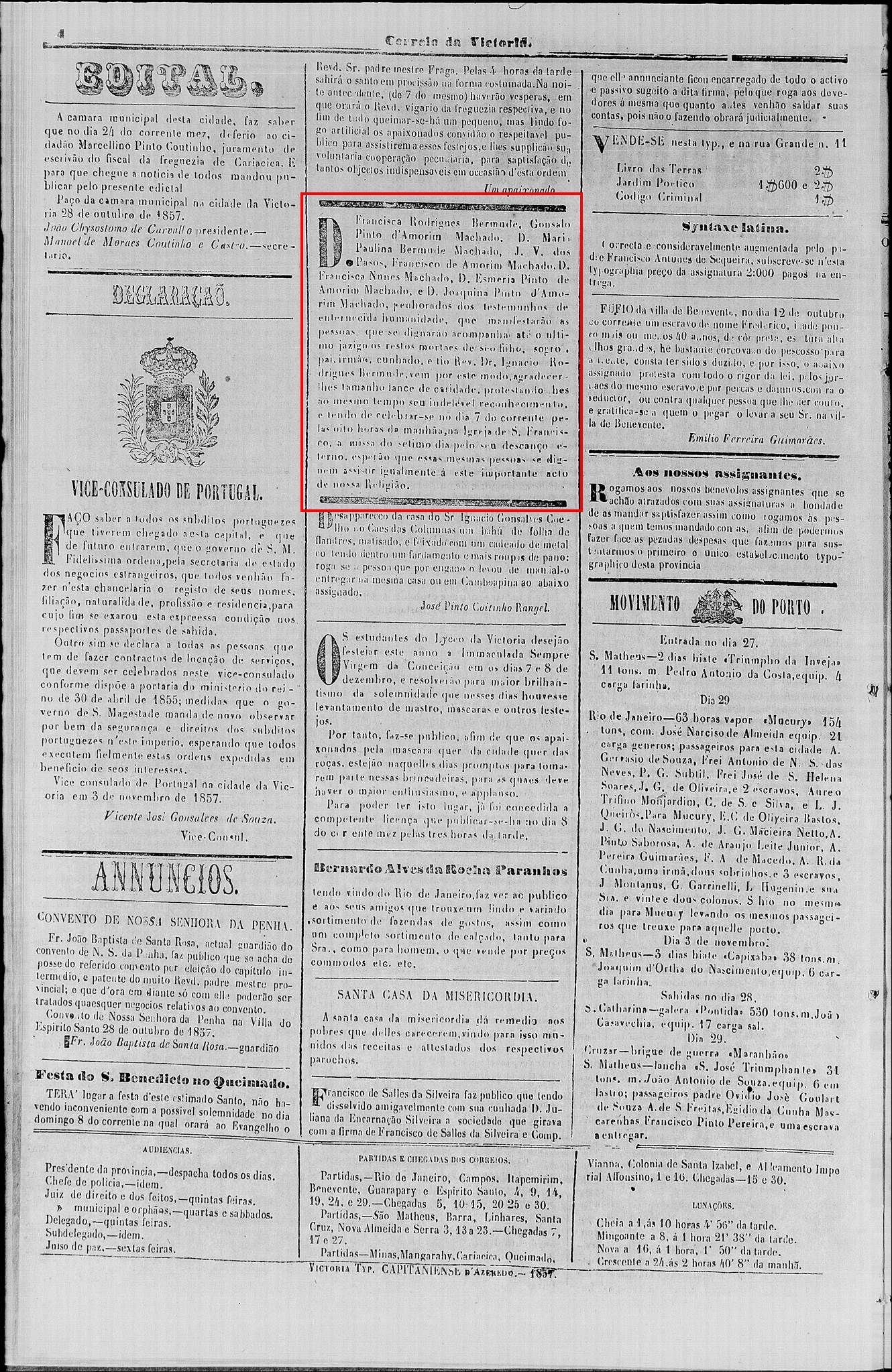 “D. Francisca Rodrigues Bermude, Gonsalo Pinto d’Amorim Machado, D. Maria Paulina Bermude Machado, J. V. dos Pasos, Francisco de Amorim Machado, D. Francisca Nunes Machado, D. Esmeria Pinto de Amorim Machado e D. Joaquina Pinto d’Amorim Machado, penhorados dos testemunhos de enternecida humanidade, que manifestarão as pessoas que se dignarão acompanhar até o ultimo jazigo os restos mortaes de seu filho, sogro, pai, irmão, cunhado e tio Rev. Dr. Ignacio Rodrigues Bermude, vem por este modo, agradecer-lhes tamanho lance de caridade, protestando-lhes ao mesmo tempo seu indelével reconhecimento, e tendo de celebrar-se no dia 7 do corrente pe-las oito horas da manhã, na Igreja de S. Francisco, a missa de setimo dia por seu descanso e-terno, esperam que essas mesmas pessoas se dignem assistir igualmente á este importante acto de nossa Religião”. In Correio da Victoria, Edição 00085 (1), 1857.