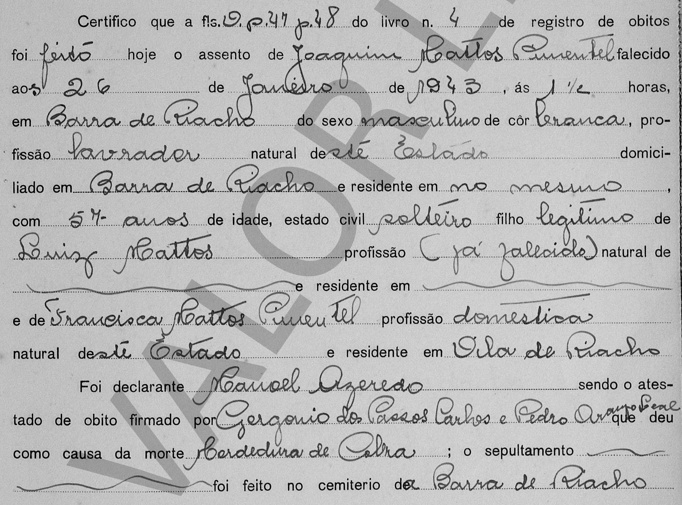 Joaquim, falecido no dia 26/01/1943, à 1,30 hora, solteiro, com 57 anos de idade, em Riacho-ES