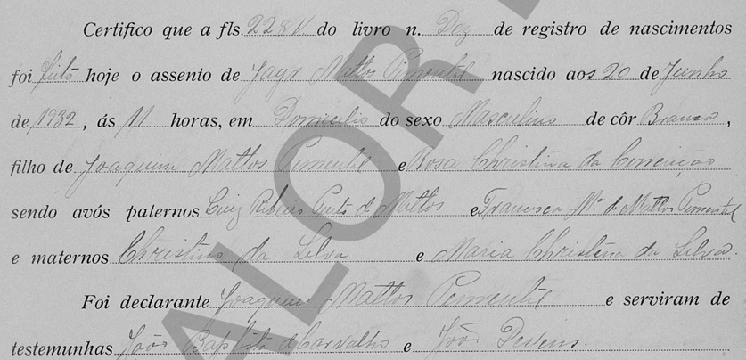 batismo página 112, no dia 21/09/1885; nascido no dia 12/10/1885 [36]
