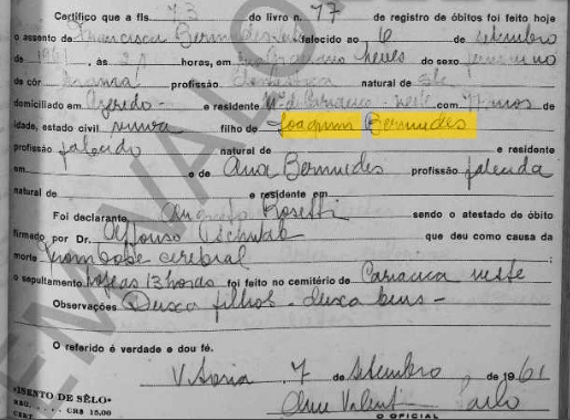 - Francisca Bermudes, falecida no dia 07/09/1961, em Vitoria, com 77 anos de idade