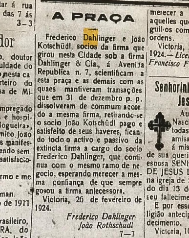 Horácia de Freitas casou no dia 09/02/1918, em Cariacica-ES, com João Frederico Dahlinger (viúvo de América de Freitas), nascido no dia 14/11/1871, natural da Alemanha, comerciante na cidade de Vitória-ES ( seleiro)