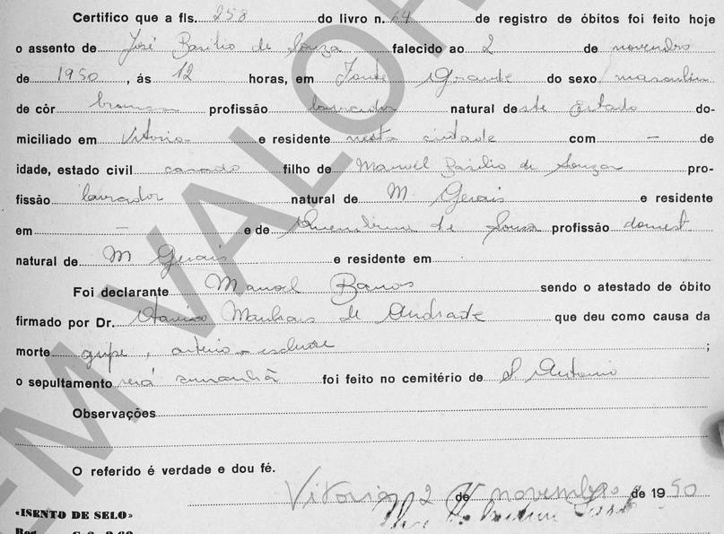 Jose Basilio de Souza faleceu no dia 02/11/1950, em Fonte Grande, Vitória-ES