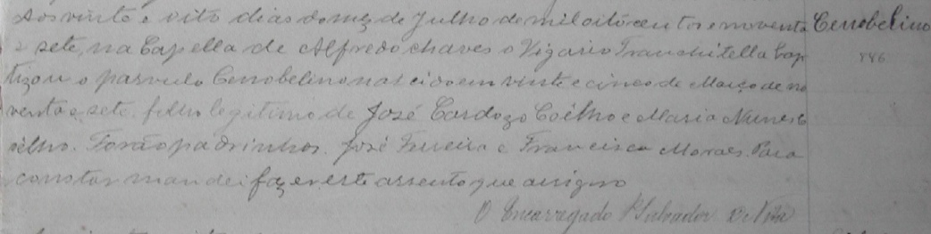 - Cenobelino, 25/03/1897. batizada no dia 28/07/1897, na Capela de Alfredo Chaves-ES