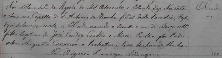 - Olindo, nascido no dia 31/03/1893, batizado no dia 27/08/1893, na capela de Santo Antonio de Iconha-ES