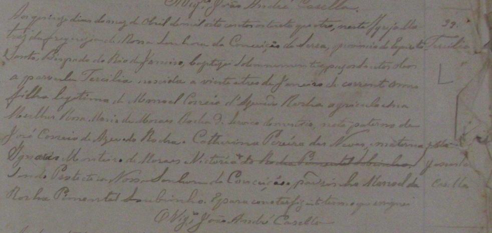 - Tercilia, nascida no dia 23/01/1884, batizada no dia 15/04/1884, na Igreja Matriz da Freguezia de Nossa Senhora da Conceição da Serra-ES
