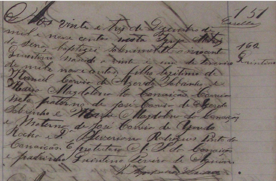 Padrinhos: Jose Torquato Fernandes de Miranda e Severiana Rodrigues Pinto da Conceição (Avó materna)