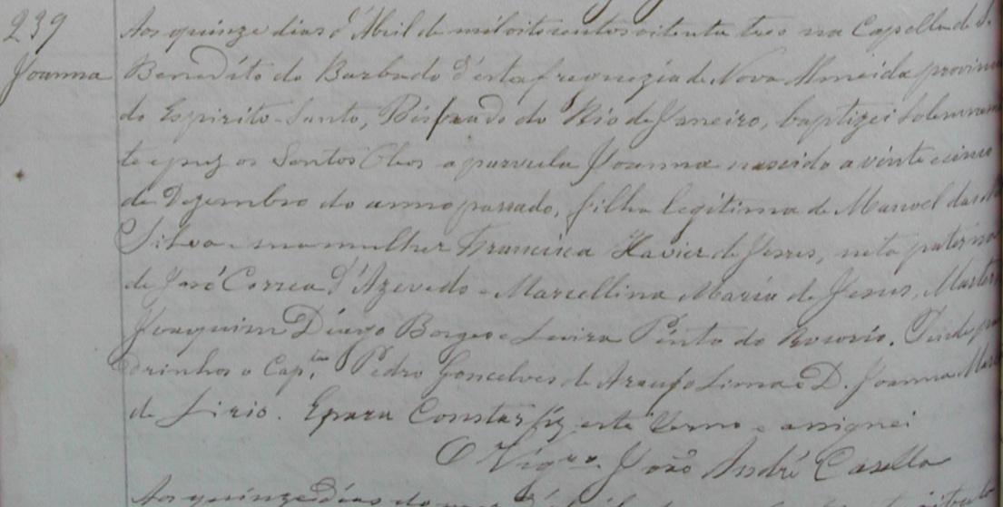 - Joanna, nascida no dia 25/06/1882, batizada no dia 15/04/1883, na Capela de São Benedito do Barbado, da freguesia de Nova Almeida-ES