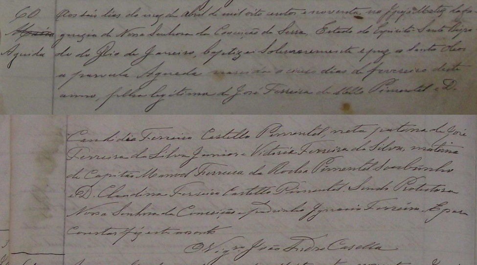 - Aguida, nascida no dia 05/02/1890, batizada no dia 06/04/1890, na Igreja Matriz da Freguezia de Nossa Senhora da Conceição da Serra-ES