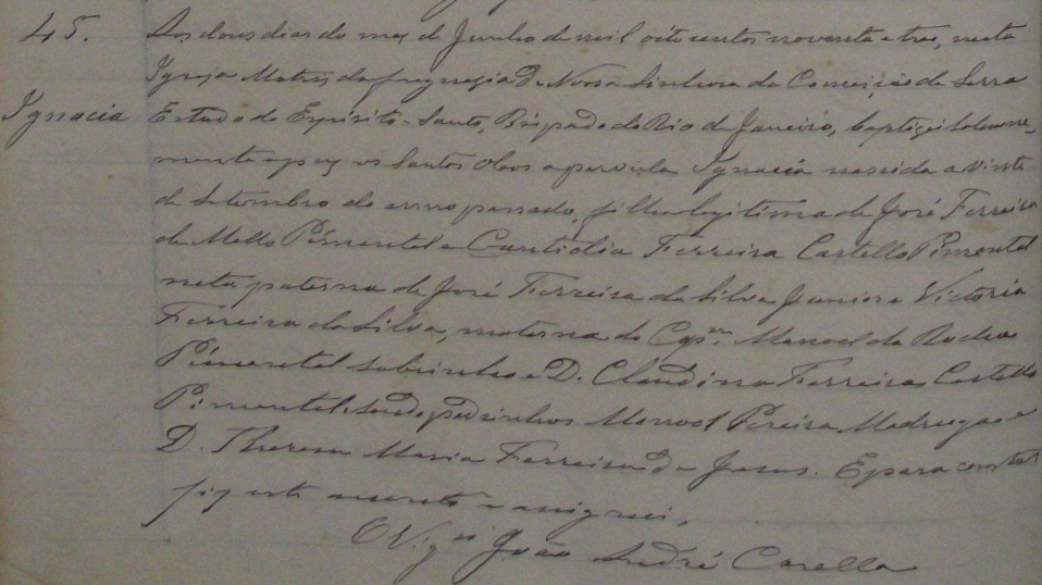 - Ignacia, nascida no dia 20/09/1892, batizada no dia 02/06/1893, na Igreja Matriz da Freguezia de Nossa Senhora da Conceição da Serra-ES