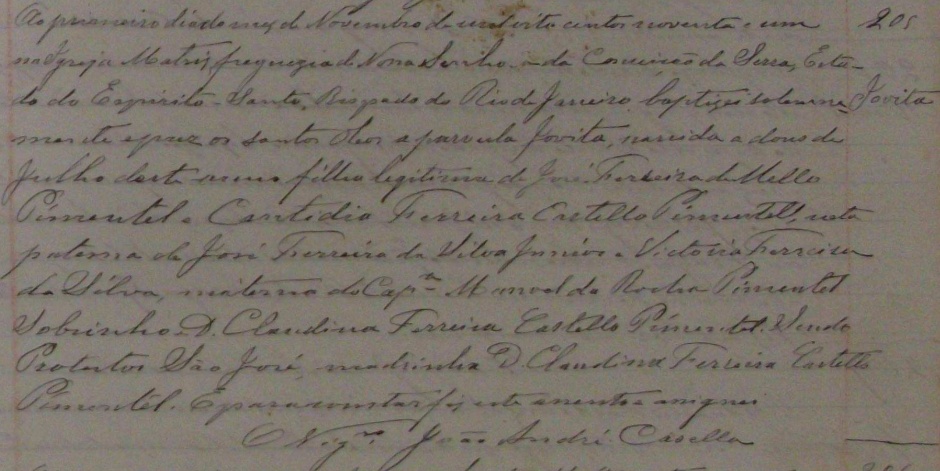 - Jovita Ferreira Pimentel, nascida no dia 02/07/1891, batizada no dia 01/11/1891, na Igreja Matriz da Freguezia de Nossa Senhora da Conceição da Serra-ES