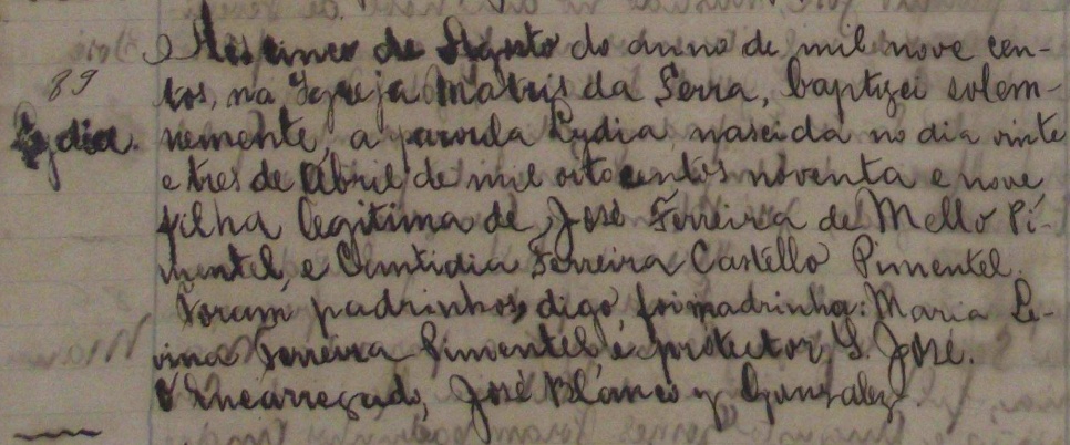 - Lydia, nascida no dia 23/04/1899, batizada no dia 05/08/1900, na igreja Matriz da Serra-ES