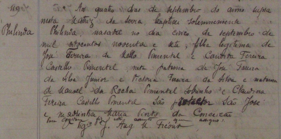 - Philinda, nascida no dia 05/09/1897, batizada no dia 04/09/1898, na Matriz da Serra-ES