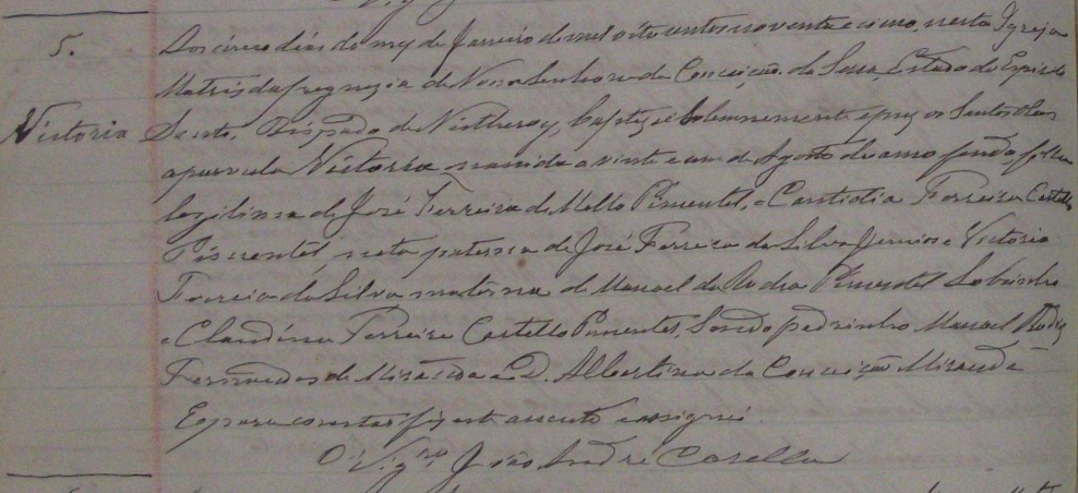 - Victoria, nascida no dia 26/08/1894, batizada no dia 05/01/1895, na Igreja Matriz da Freguezia de Nossa Senhora da Conceição da Serra-ES
