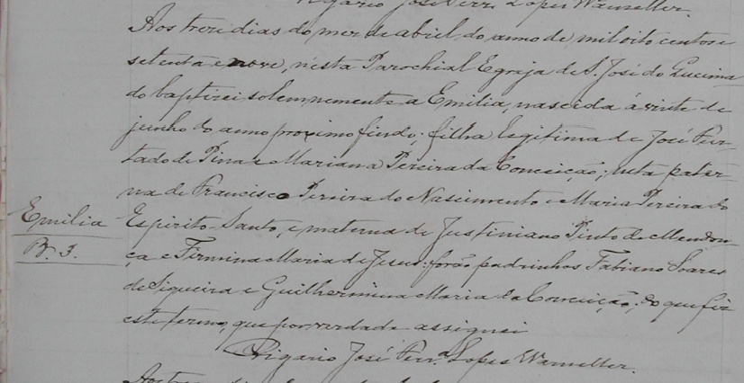 Emilia, nascida no dia 20/06/1878, batizada no dia 13/04/1879, na Parochial Igreja de São Jose do Queimado-ES