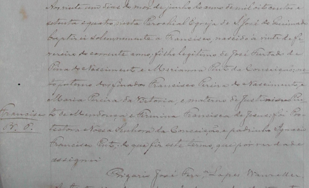Padrinho: Ignacio Francisco Pinto (tio materno) filho de Justiniano Pinto de Mendonça e Firmina Francisca (Maria) de Jesus