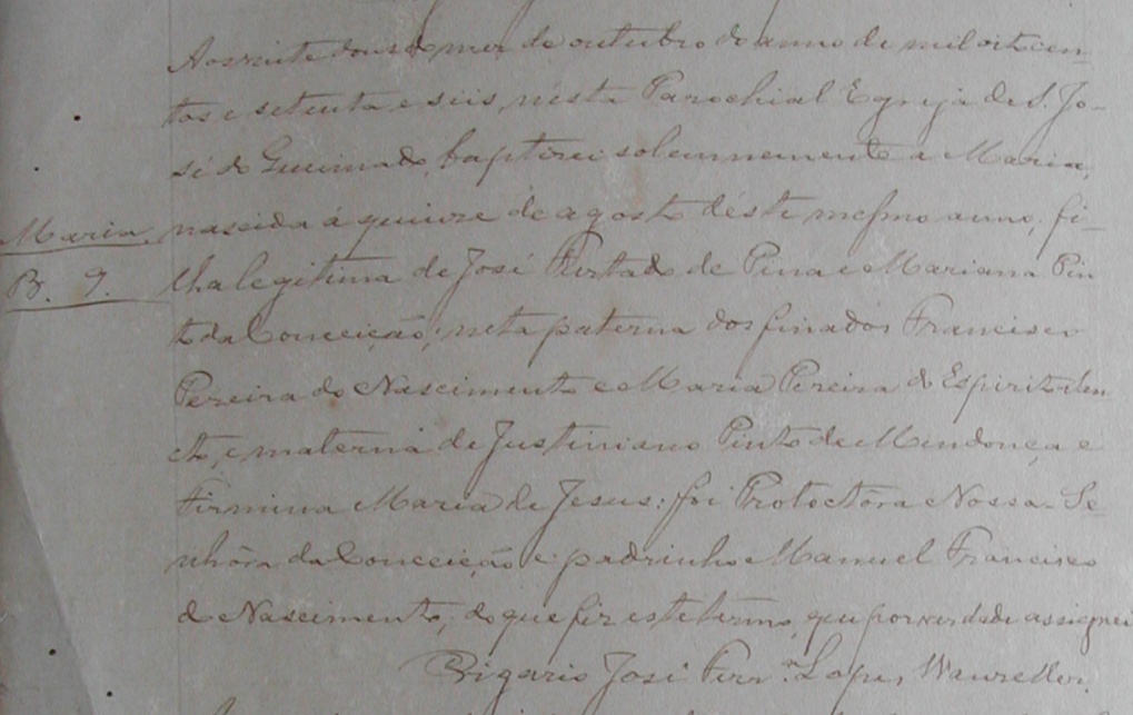 Maria, nascida no dia 15/08/1876, batizada no dia 22/10/1876, em São Jose do Queimado-ES