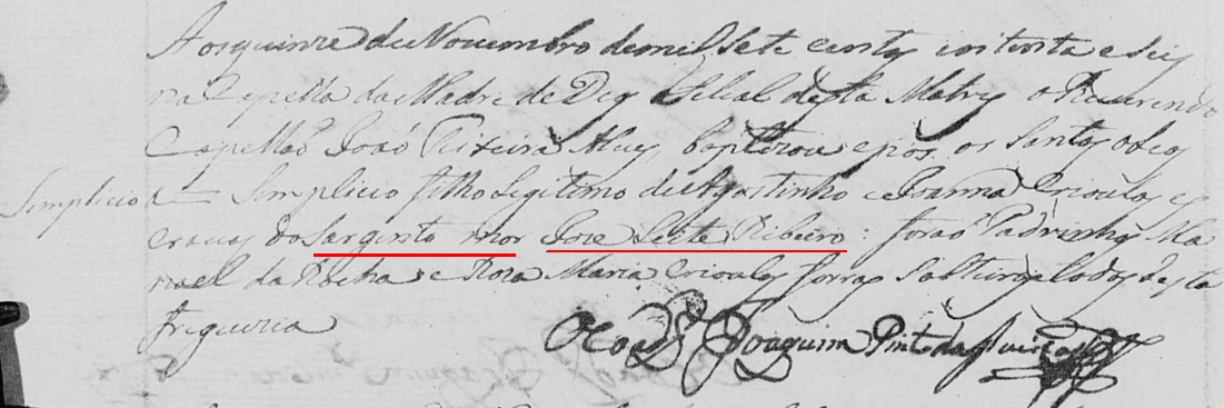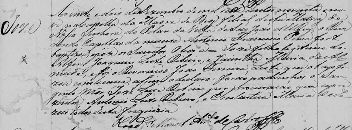 Jose, batizado no dia 22/12/1799, na Capela da Madre de Deus, filial da matriz de Nossa Senhora do Pilar da Vila