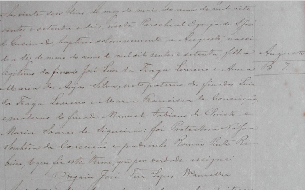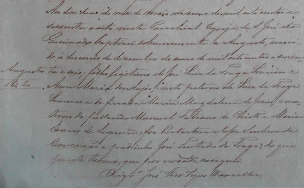 Augusto, nascido n o dia 10/05/1870, batizado no dia 26/05/1872, em São Jose do Queimado-ES