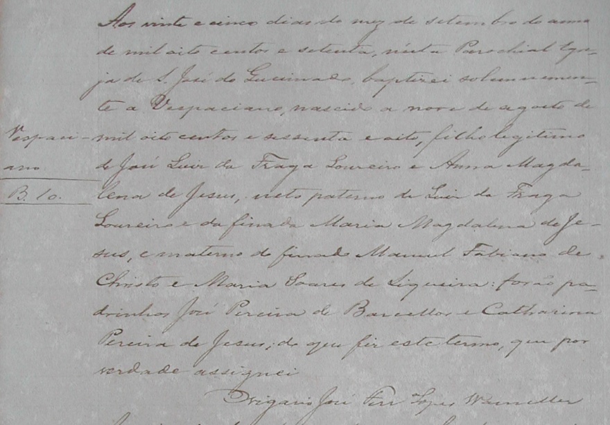 Vesparsiano, nascido no dia 09/08/1868, batizado no dia 25/09/1870, em São Jose do Queimado-ES