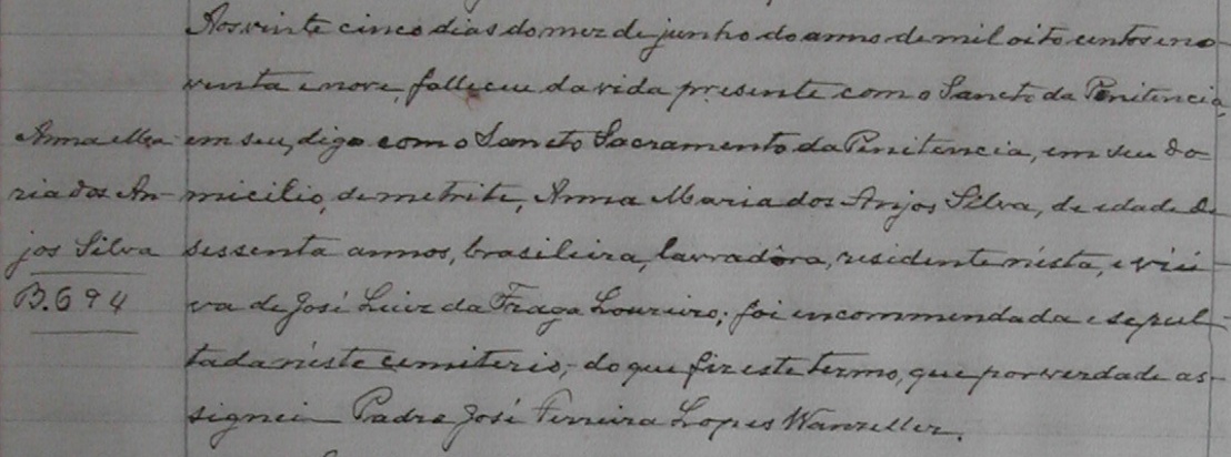 Anna Maria dos Anjos Silva, falecida no dia 25/06/1899, com 60 anos de idade, em São Jose do Queimado - ES)