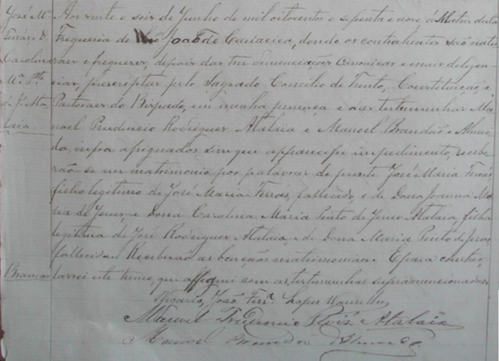 Casaram-se no dia 26/06/1869, na Matriz da Freguezia de São João de Cariacica-ES