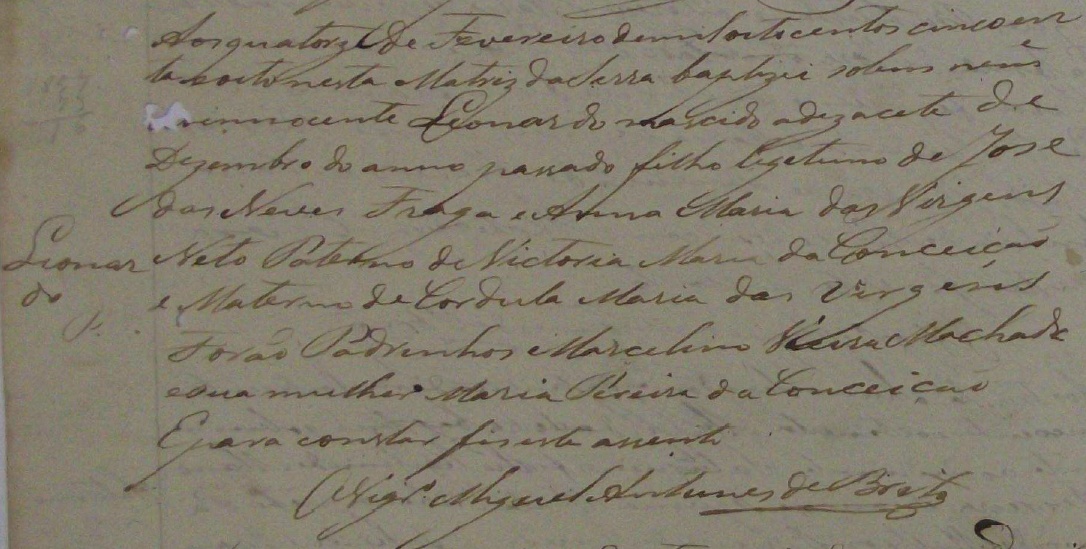 - Leocadina (P), nascida no dia 18/10/1870, batizada no dia 02/07/1871, na Parochial Igreja de São Jose do Quemado-ES