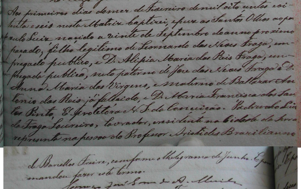 Leonardo das Neves Fraga (empregado público) c.c. Alipia Maria dos Reis Fraga (empregada pública), filha de Baltazar Antonio dos Reis (já falecido em 01/02/1886) e Maria Francisca dos Santos Pinto